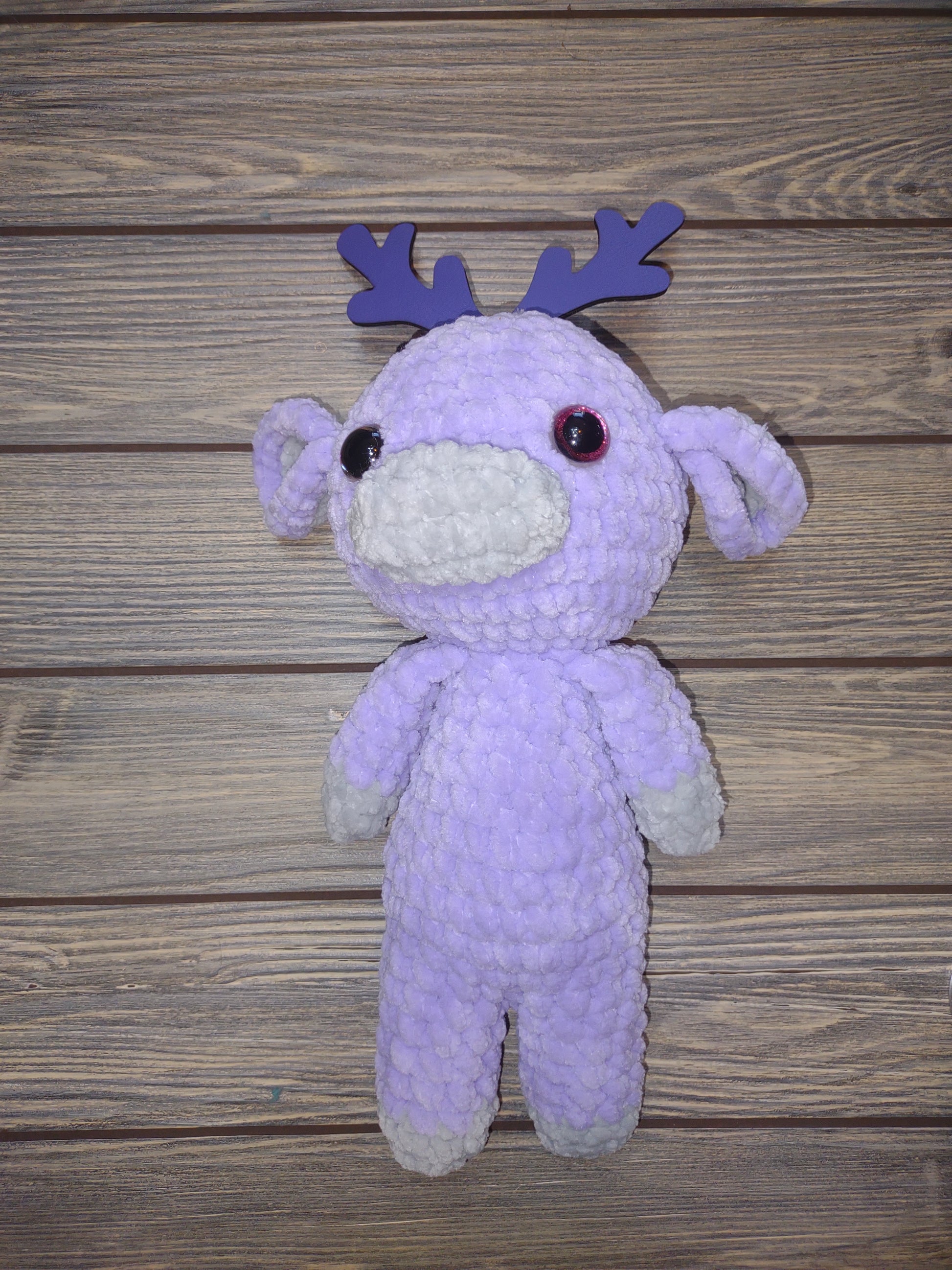 This is a hand crocheted reindeer. He measures roughly 12" tall and is super soft. He is made using safety eyes and pleather antlers so he is not meant for children under 3 years of age. Adult supervision during play is highly recommended. Monitor for wear and tear. Not machine washable. Spot clean only.