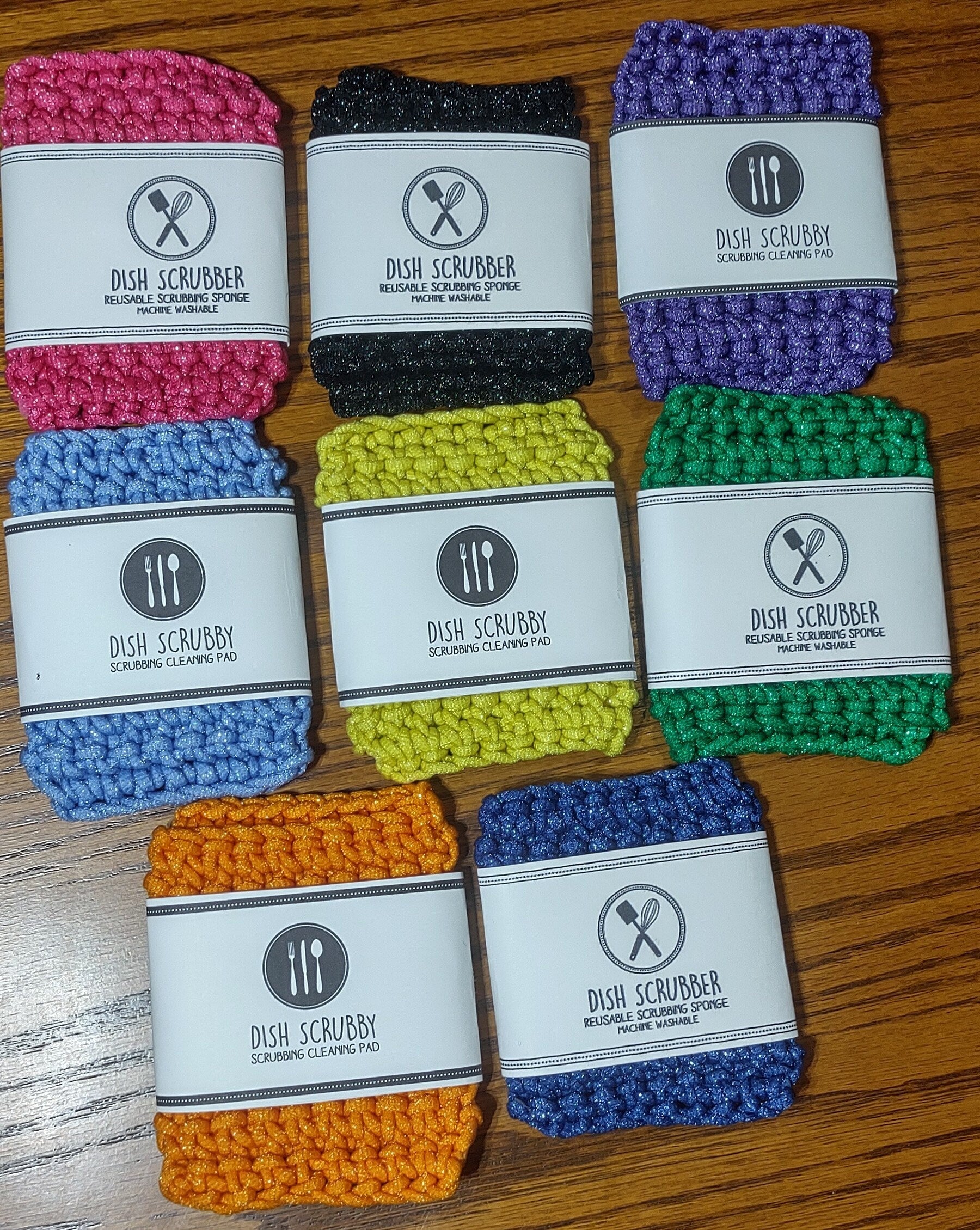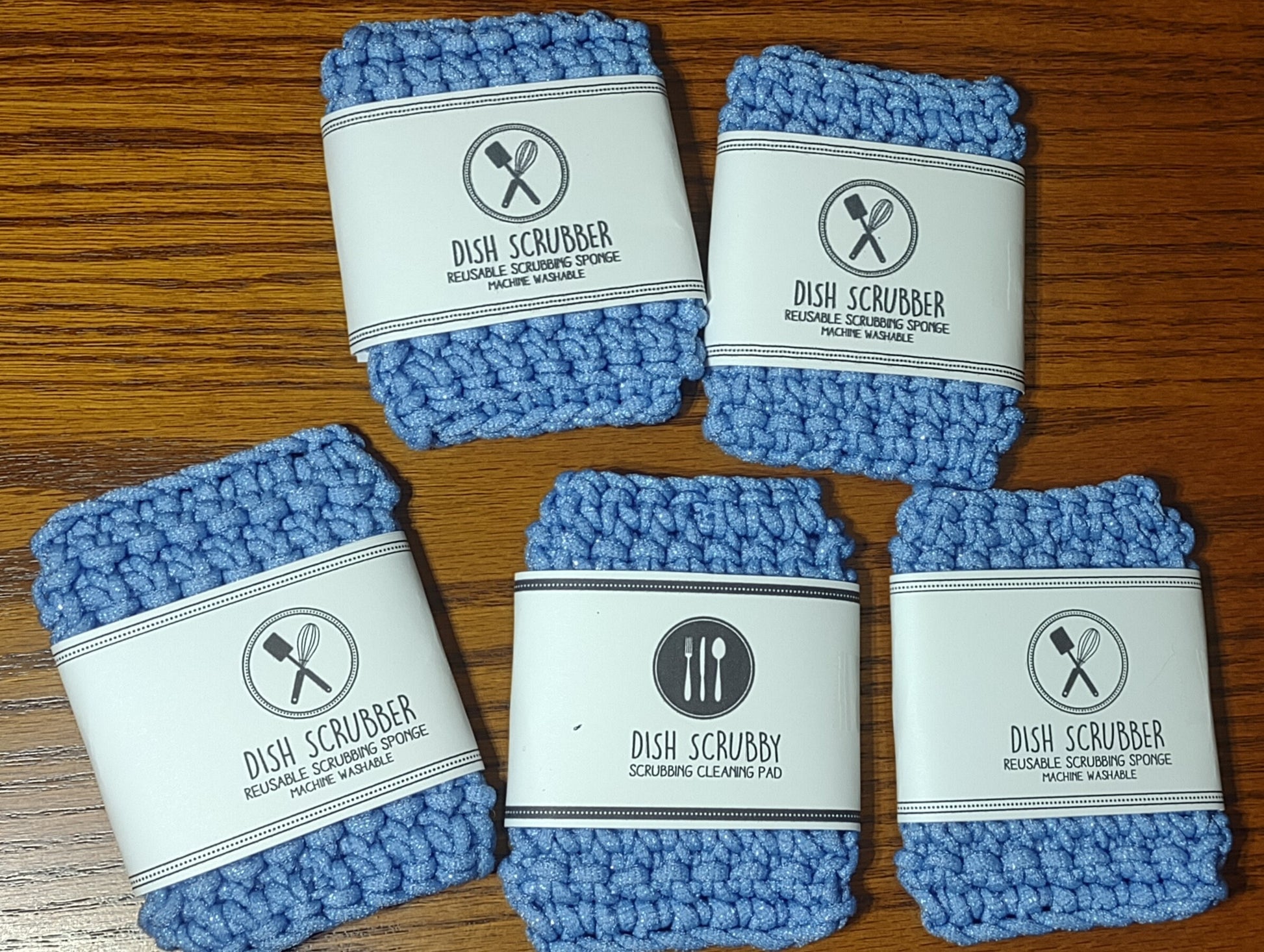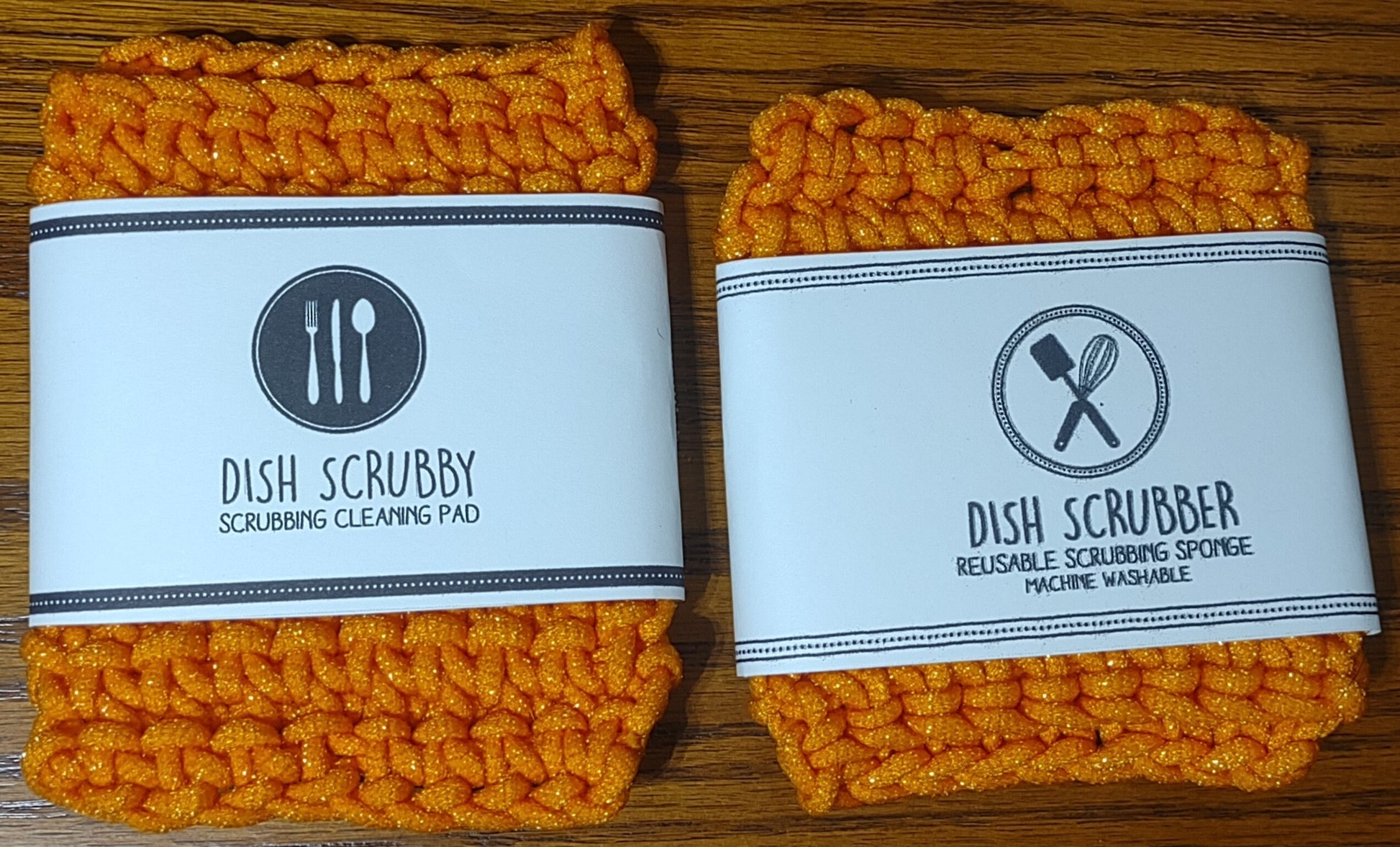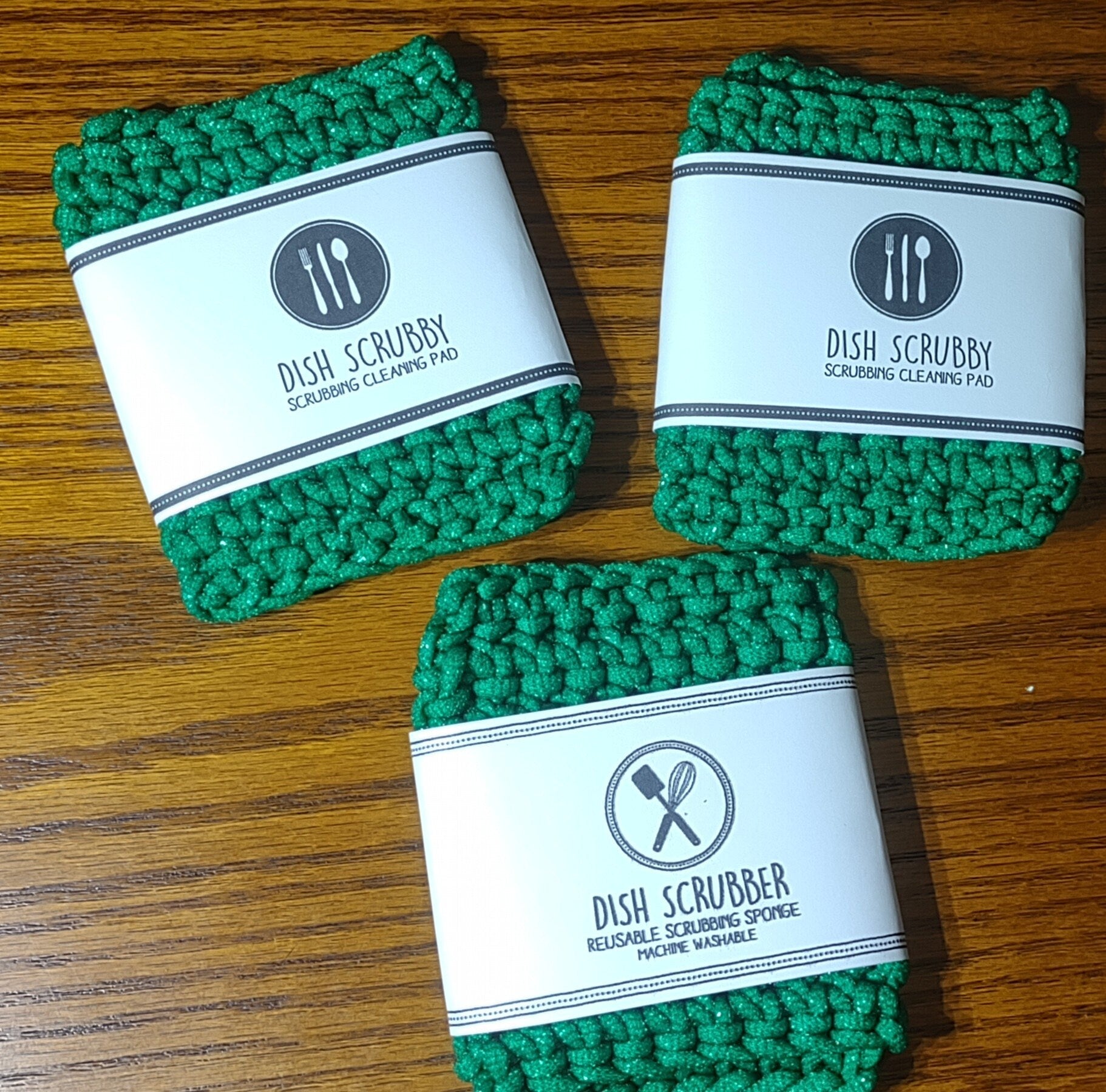 This is a great little reusable dish scrubber. It is crochet out of 100% nylon yarn. It is safe to use on non-stick pots and pans. It will not scratch dishes or pans.